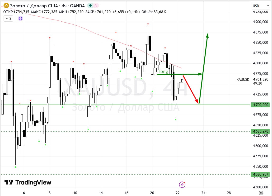 Уровень поддержки на $4700 устоял. Несмотря на это, техническая картина на Н4 пока указывает на преимущество медведей и золото может вернуться к снижению.