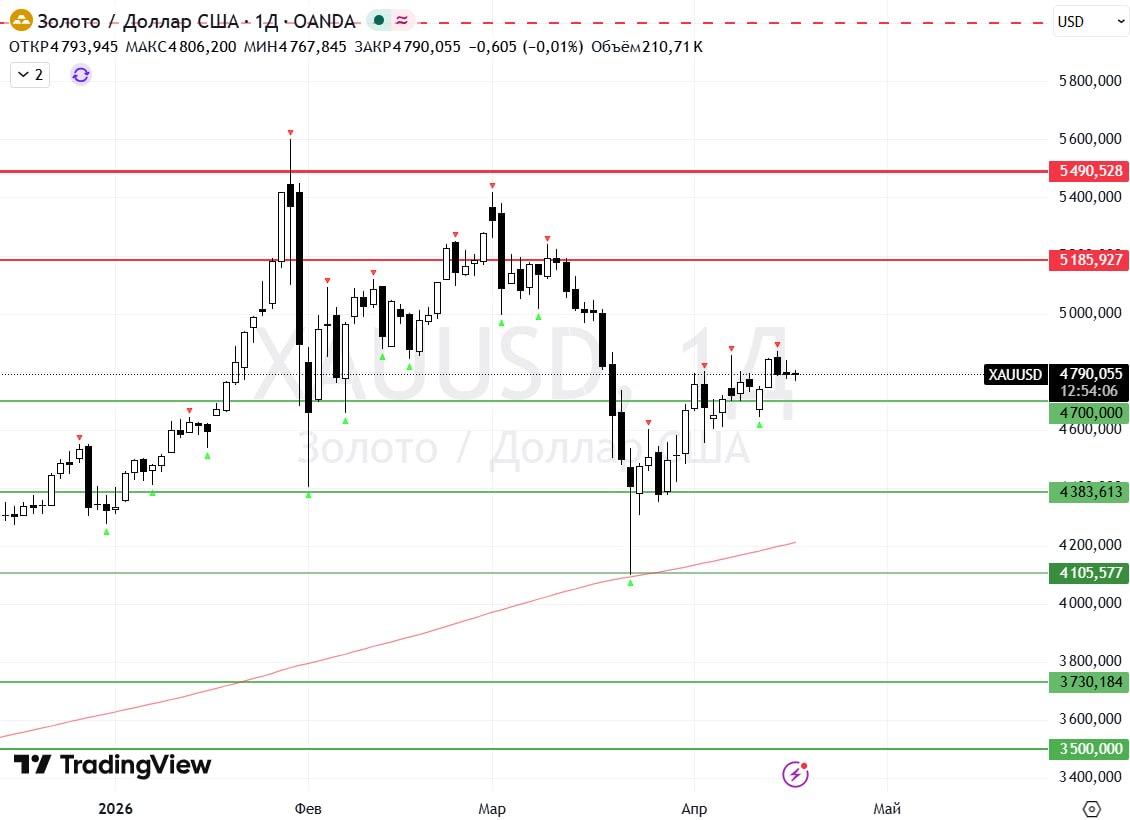 Прогресс в переговорах США–Иран продолжит снижать нефтяные цены и инфляционные ожидания. Это ослабляет давление на золото со стороны монетарной политики. Но с технической точки зрения золото пока выглядит слабо. С начала недели быкам не удалось существенно продвинутся выше.