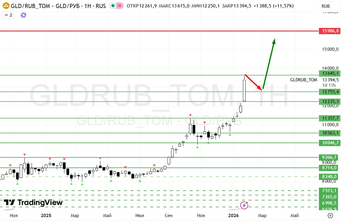 Золото в рублёвой оценке достигло отметки 13600 руб.- максимальной цели которую мы установили в начале декабря. Разумеется, это не говорит об окончании роста, но это хорошая отметка чтобы зафиксировать часть прибыли. Новый таргет 16000 руб.