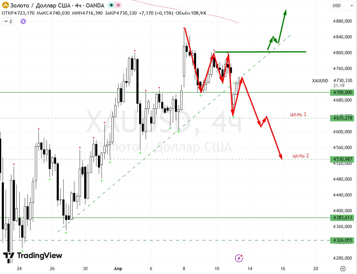 Теперь металл может снизится к $4635 и $4530 в рамках реализации паттерна "третья волна" вниз.